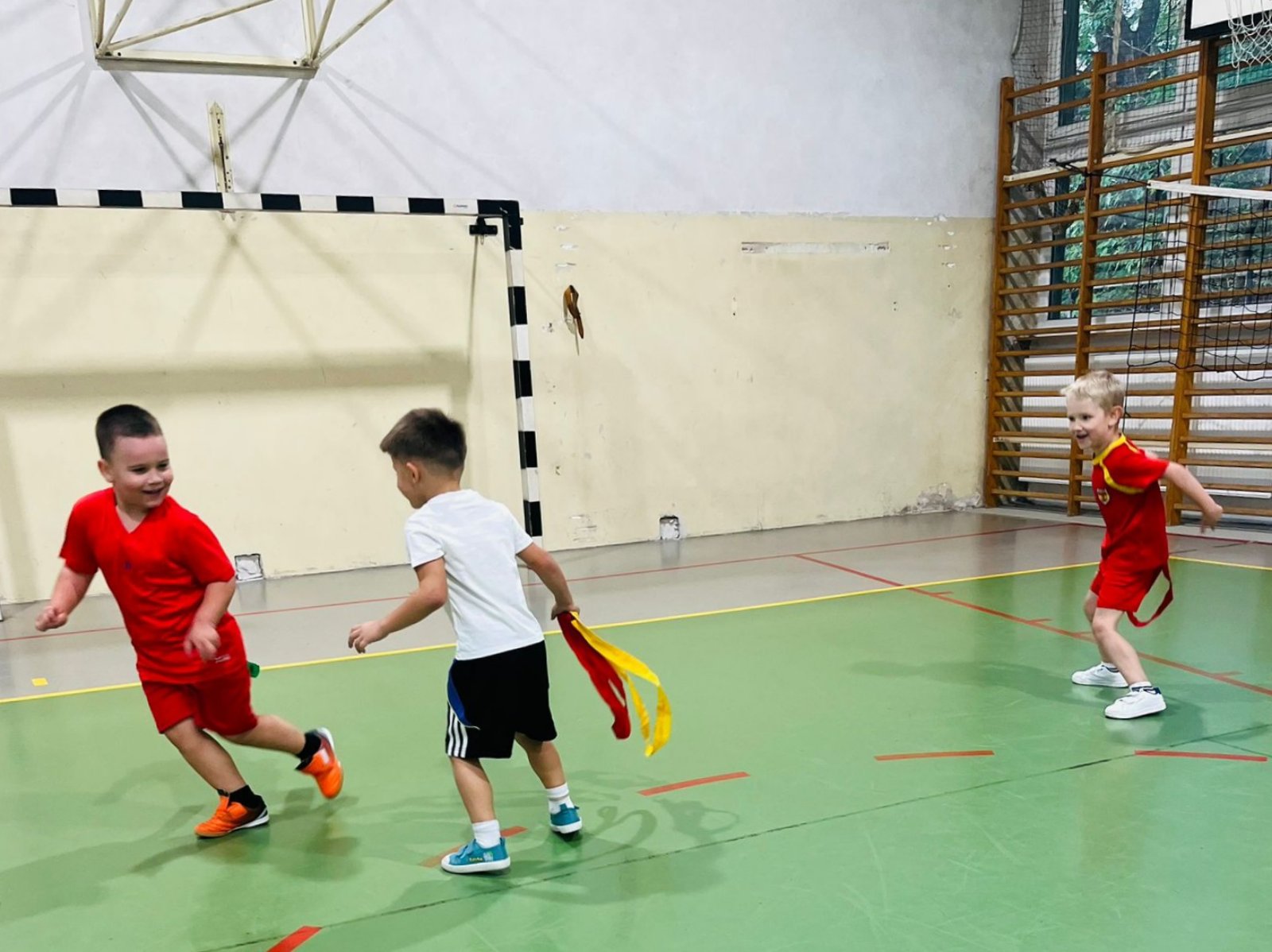 Sportowe zajęcia z trenerami piłki nożnej na sali gimnastycznej