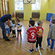 Instruktorzy z Recordu prowadzili zajęcia wprowadzające do gry w piłkę nożną podczas zajęć na sali gimnastycznej.